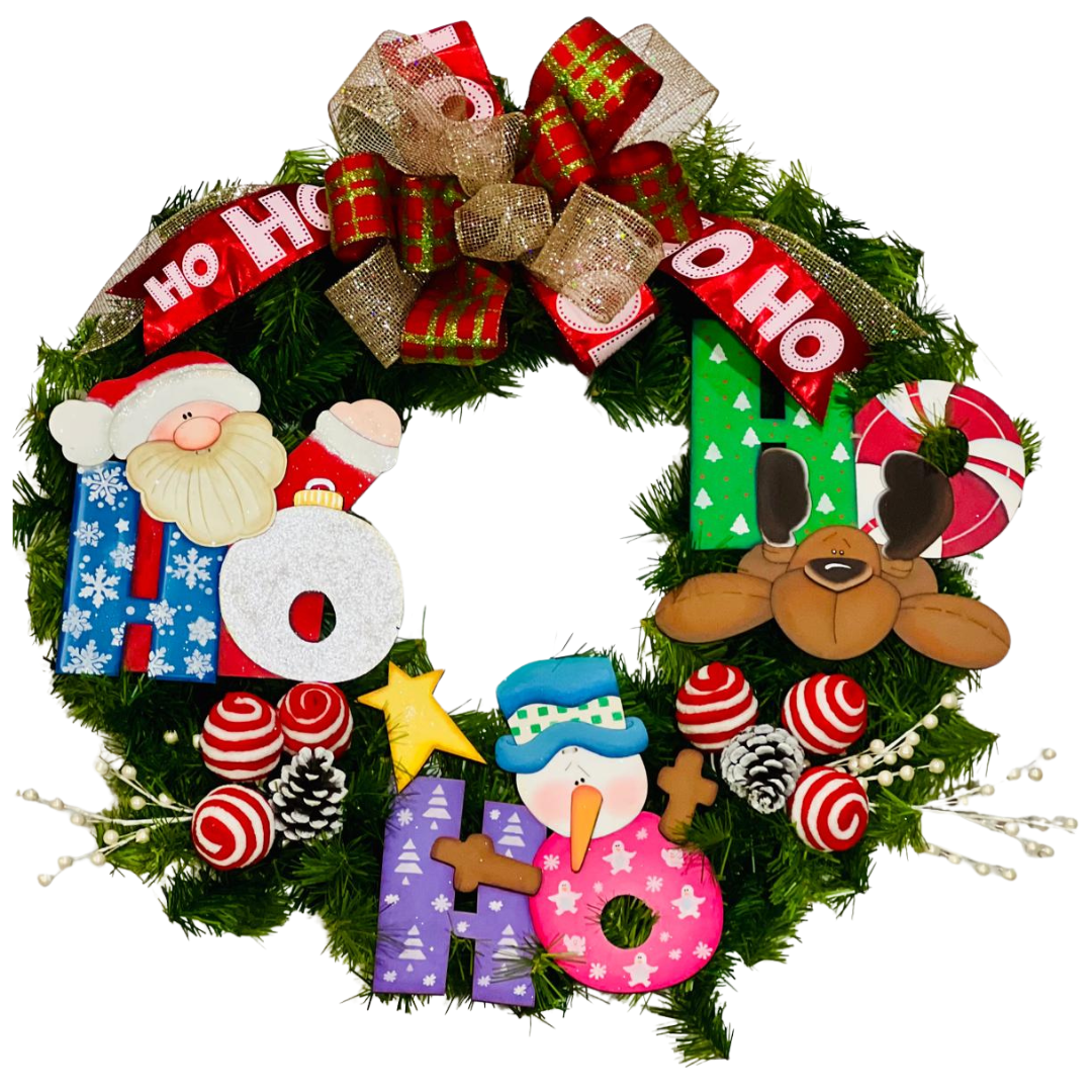 Corona Navideña que incluye Santa, un muñeco de nieve y un reno