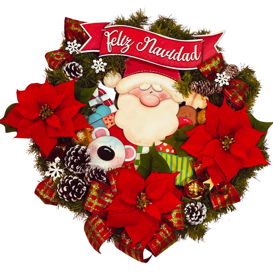 Corona Navideña con nochebuenas que incluye Santa, oso polar y un reno