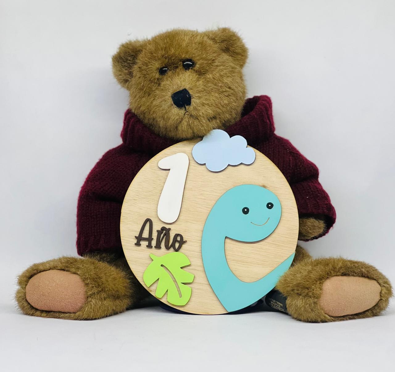 Celebra cada mes del primer año de tu bebé con estos adorables letreros de madera pintados a mano con temática de dinosaurios. Cada pieza representa un mes (1-11 meses y 1 año) con diseños coloridos y divertidos que harán tus fotos aún más especiales.